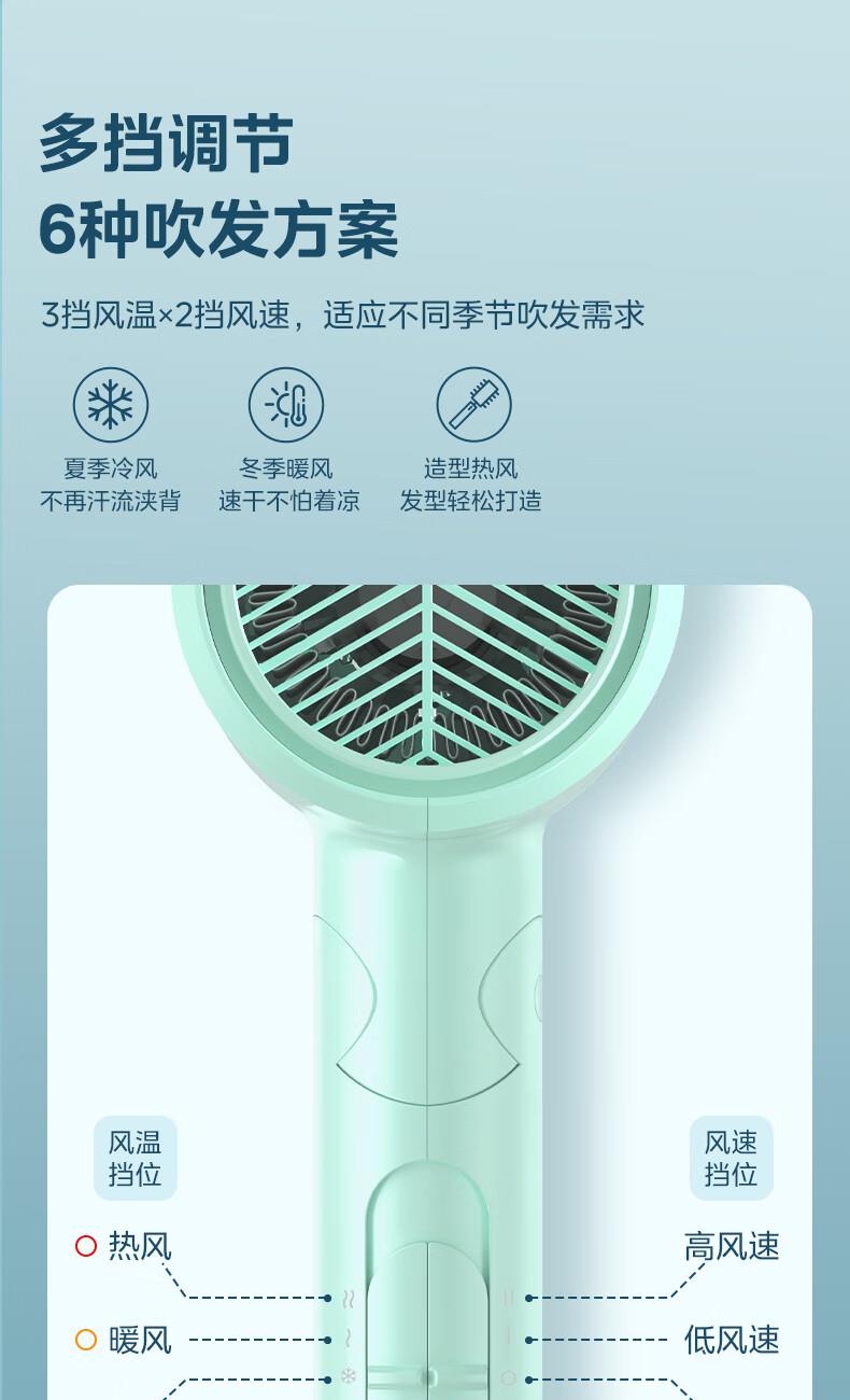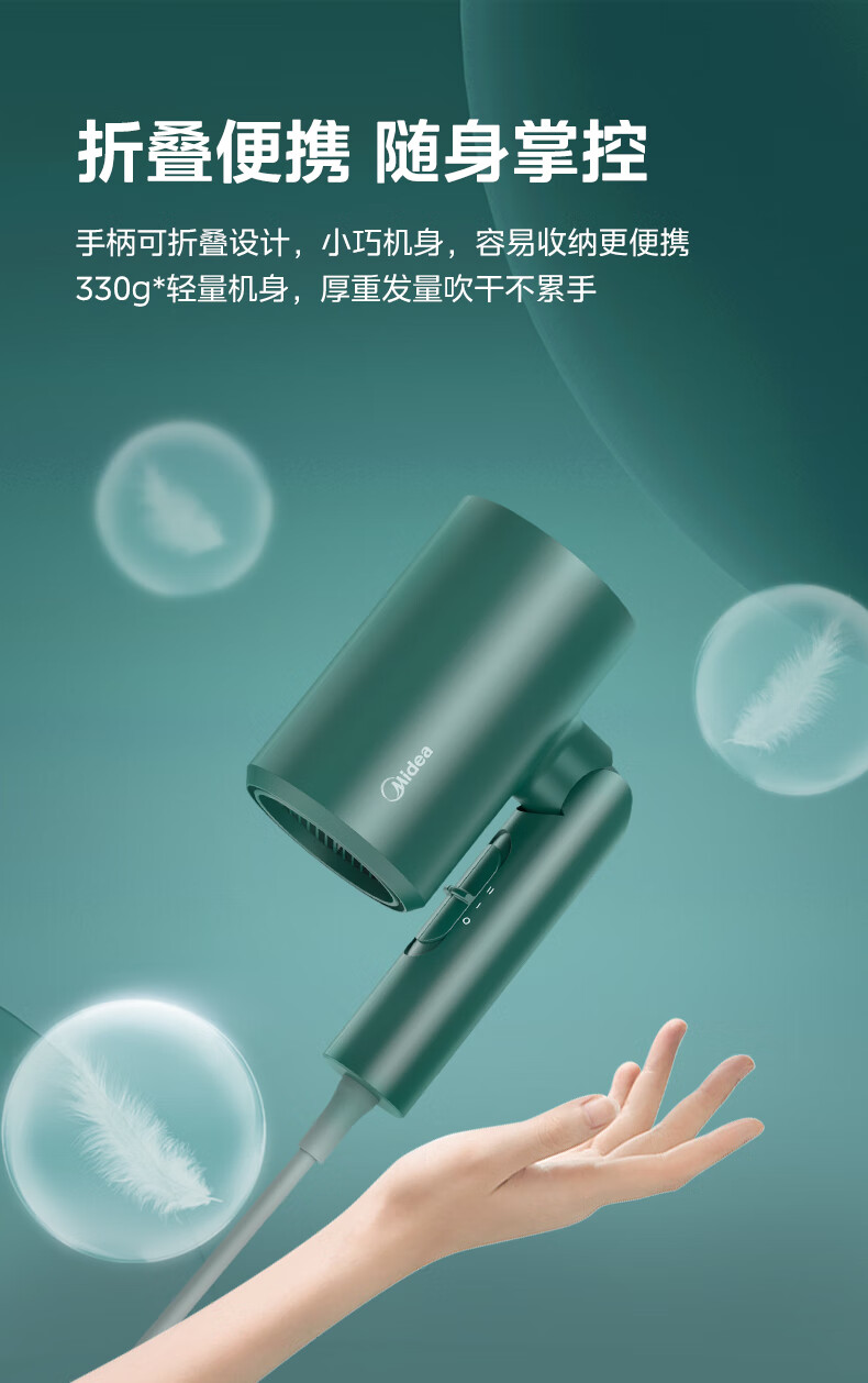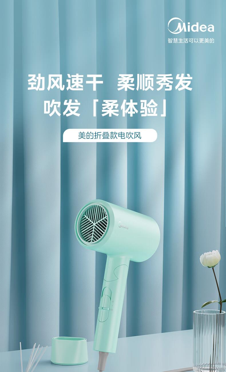型号:AJ0701 产品净重:0.32kg 劲风速干 柔顺秀发吹发「柔体验」 美的折叠款电吹风 可折叠机身 1亿负离子 1800W大功率 双重温度保护 蜂窝导流设计 6种吹发方案