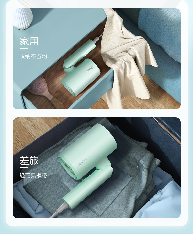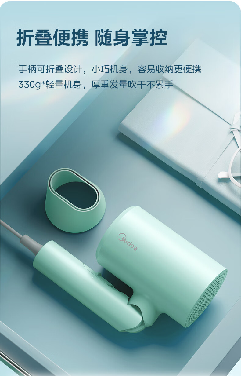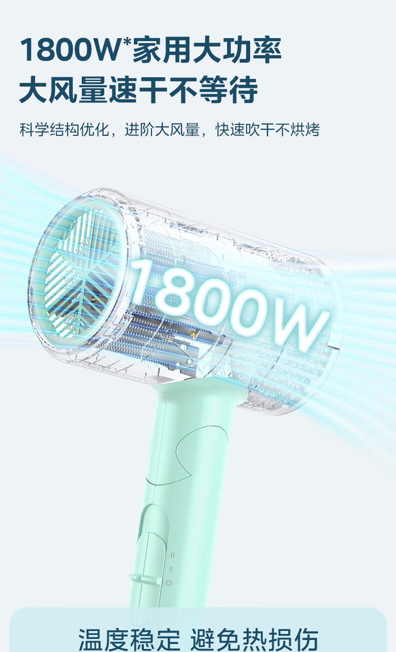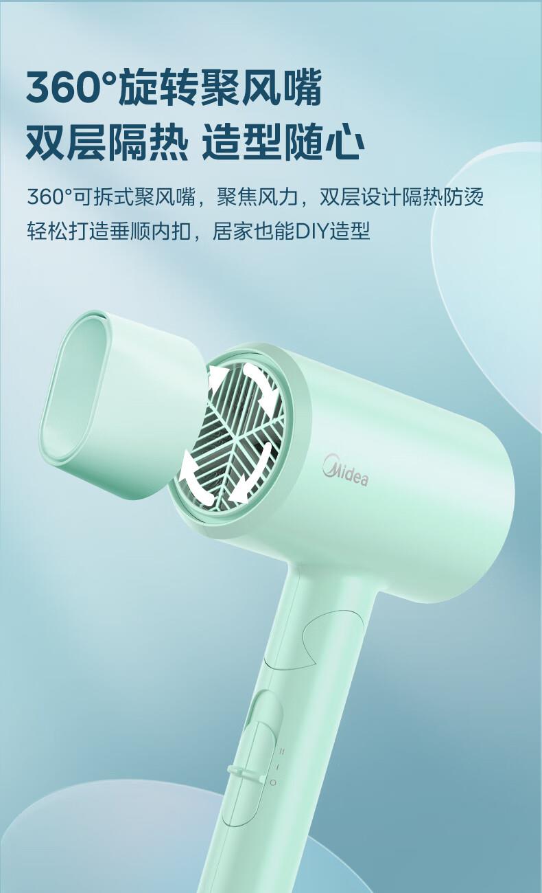 型号:AJ0701 产品净重:0.32kg 劲风速干 柔顺秀发吹发「柔体验」 美的折叠款电吹风 可折叠机身 1亿负离子 1800W大功率 双重温度保护 蜂窝导流设计 6种吹发方案