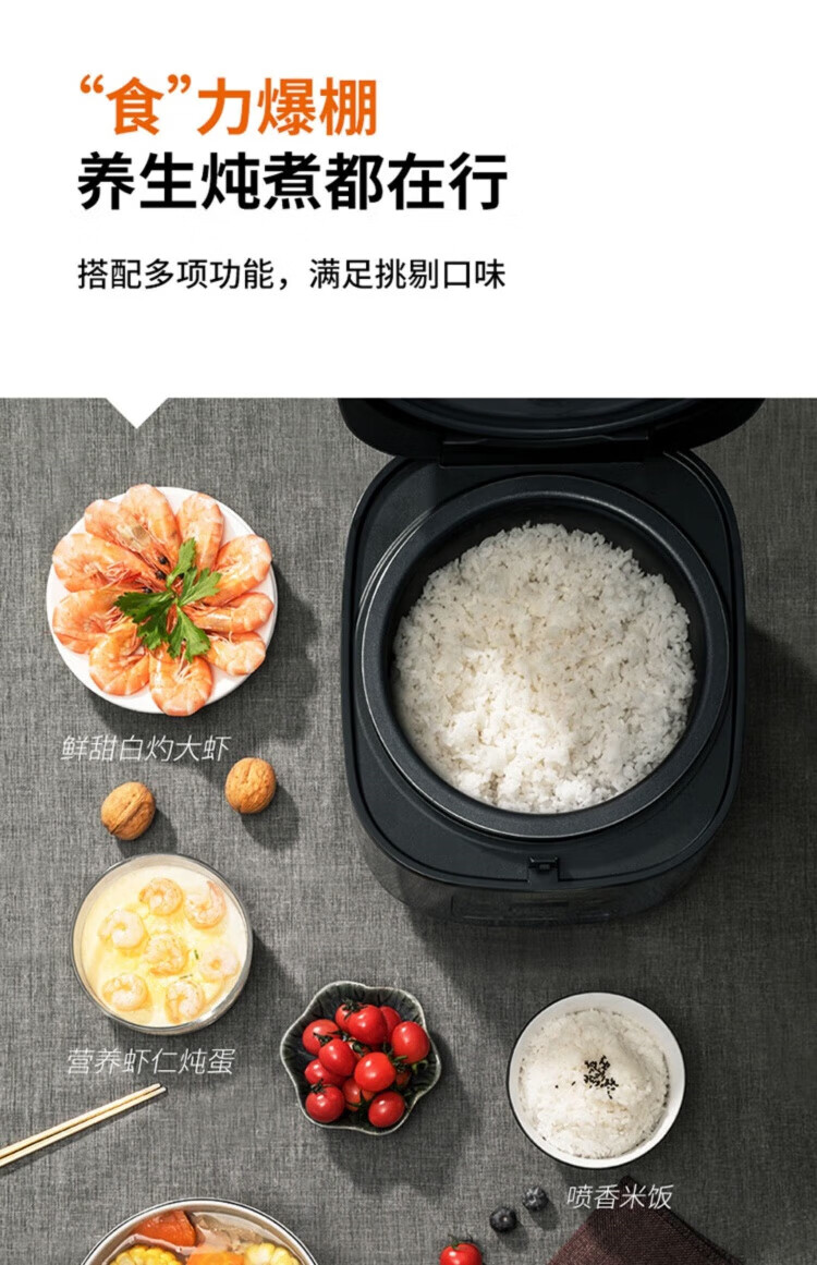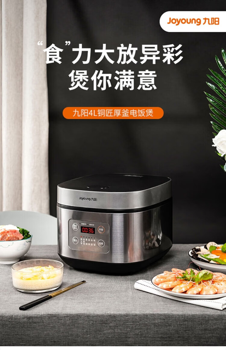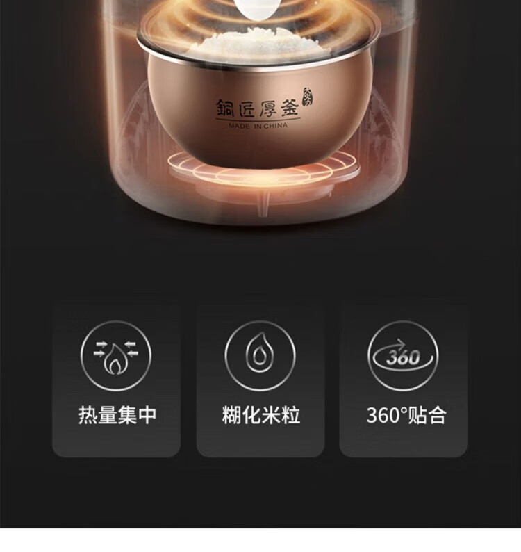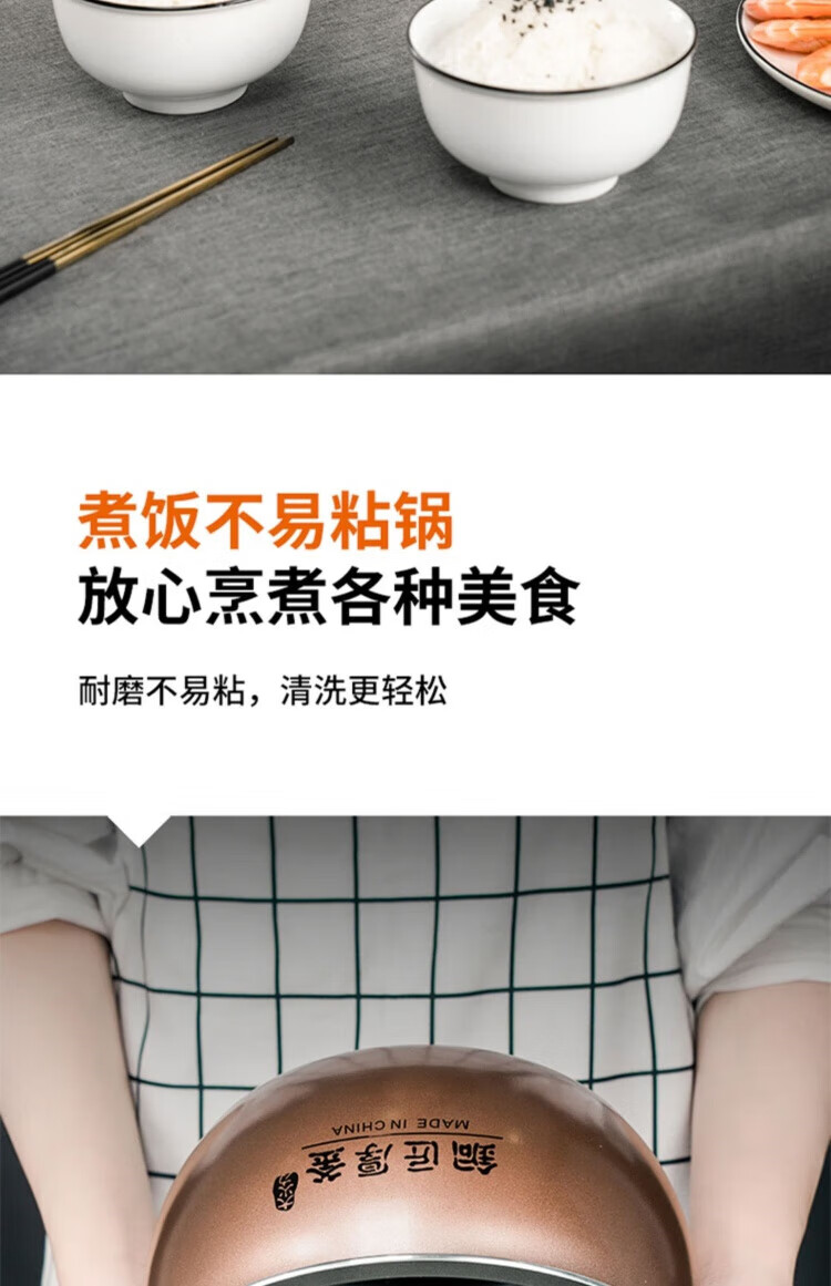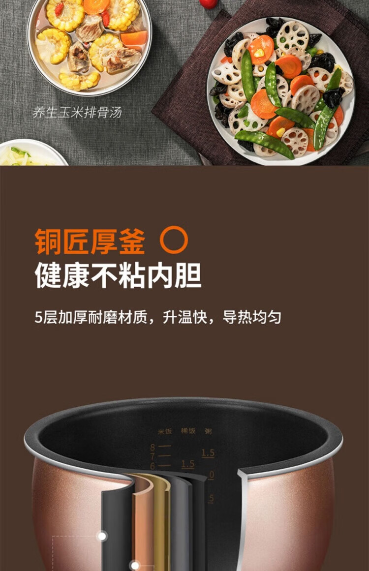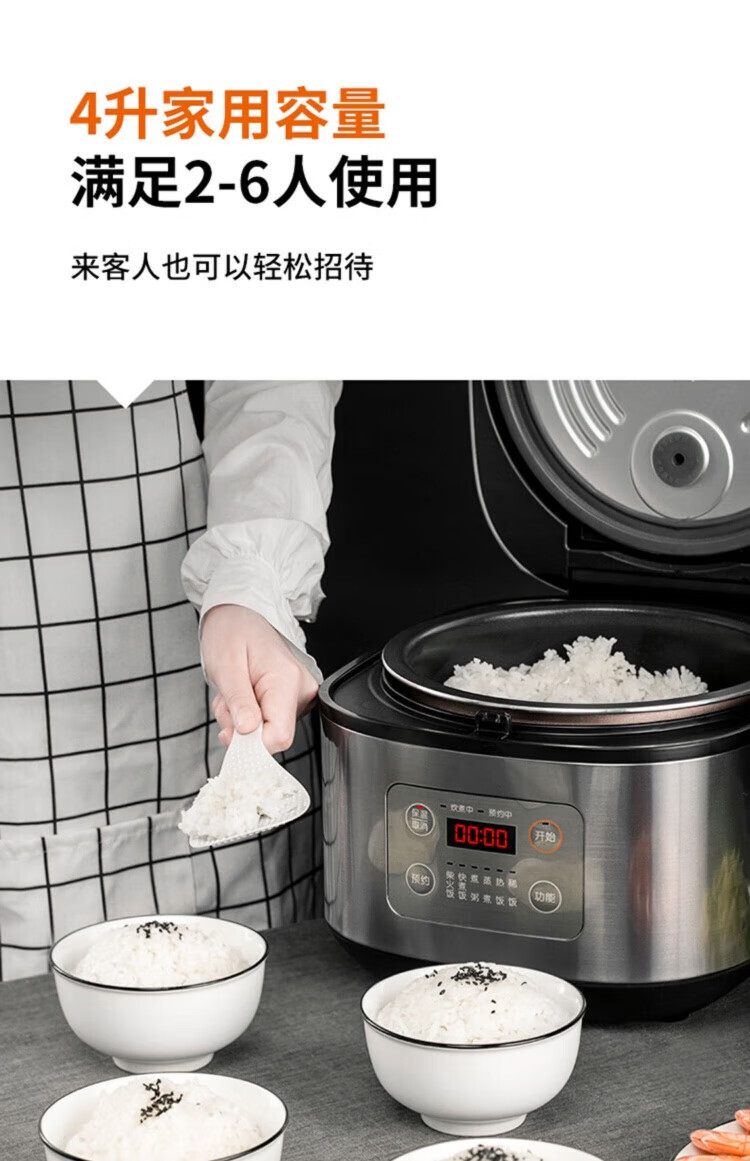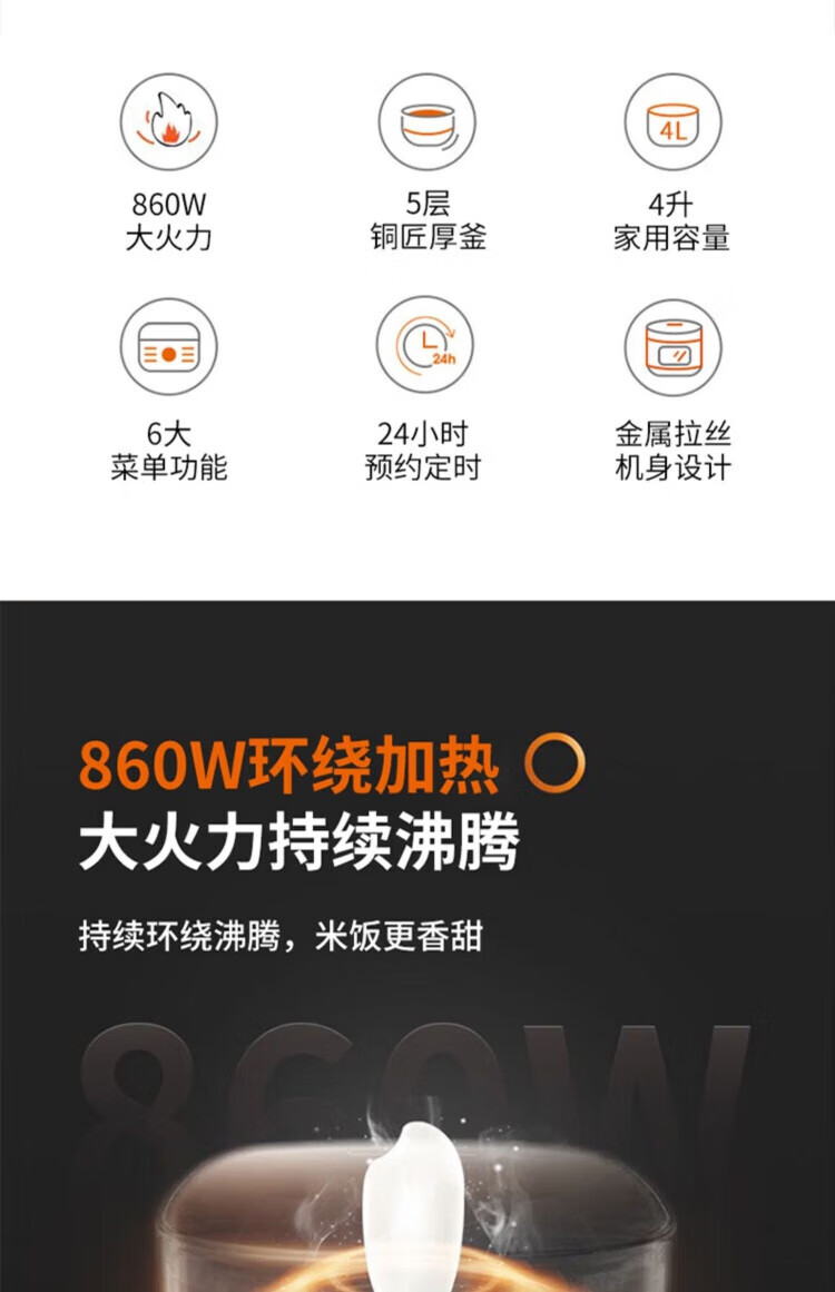 容量:4L 型号:F40FY-F333 860W大火力 6大菜单功能 5层铜匠厚釜 24小时预约定时 4升家用容量 金属拉丝机身设计